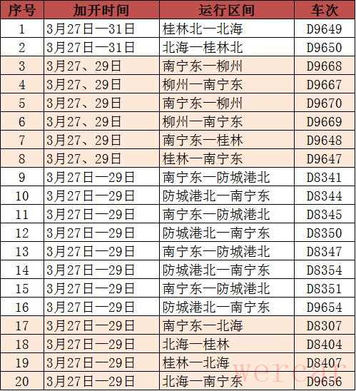 不仅是南宁至武汉动车,为更好满足广西区内复工复产人员的短途出行需求,从3月27日起,南宁局集团公司陆续安排管内恢复开行20列动车组列车(见附表)。