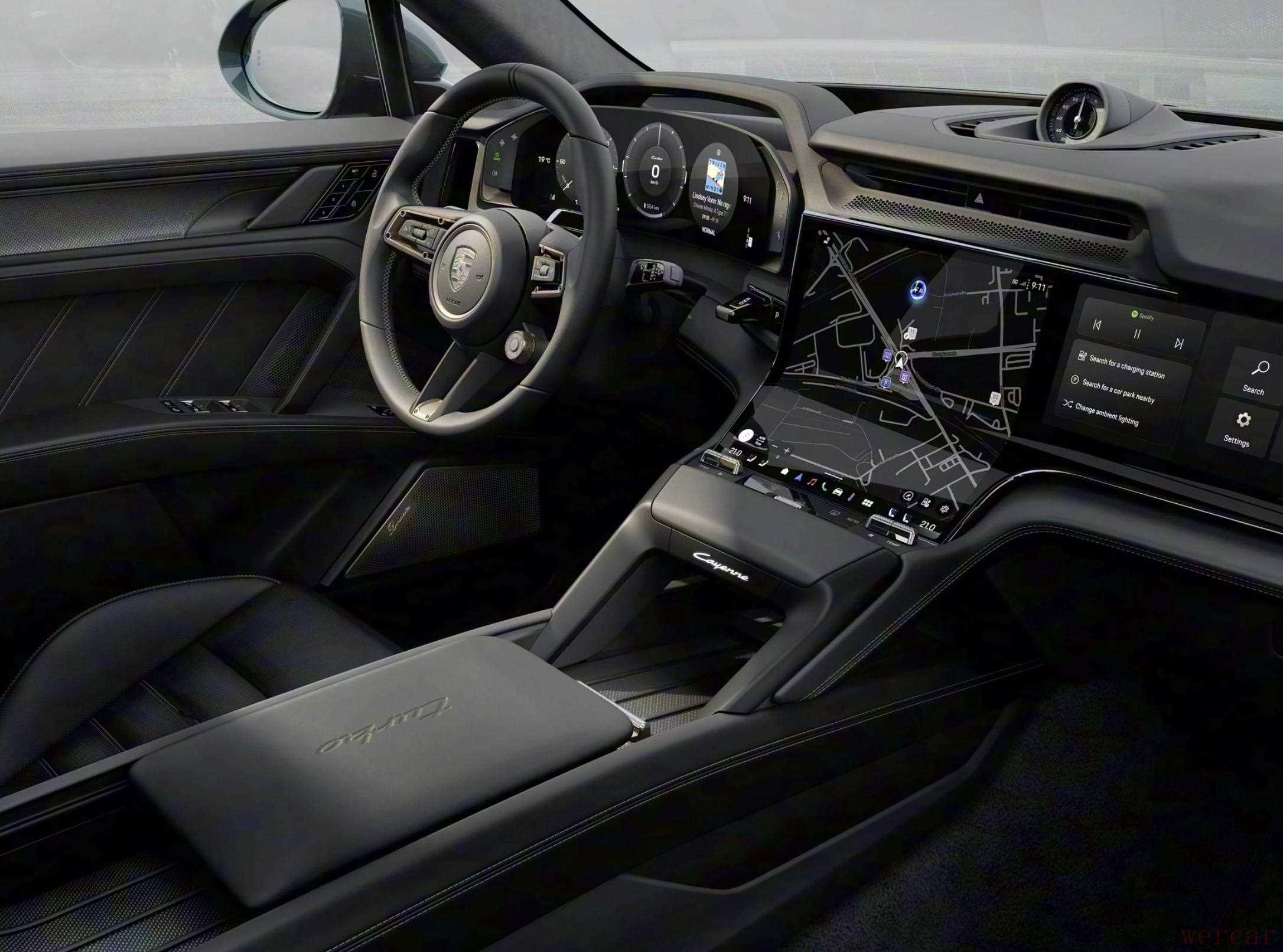 保时捷Cayenne Electric的内饰采用了大量Alcantara材质、缝线及红色元素的应用,红黑双色的搭配和翻毛皮材质,再加上包裹性和支撑性更好的运动赛车座椅,营造出更加浓郁的战斗氛围。翻毛皮三幅式方向盘+换挡拨片。配备了14.25英寸OLED全数字仪表盘、14.9英寸的副驾娱乐屏,并可选配87英寸的增强现实(AR)抬头显示系统;中控台配备了官方名为“Flow Display”流动显示屏的12.25英寸触控屏幕,带来了最直观的视觉冲击力,还构成了全新研发的保时捷驾驶体验系统(Porsche Driver Experience)。操控方面,该车配备了保时捷经典的三辐式多功能方向盘(集成了驾驶模式选择按键和一键启动按钮),操控岛区域变得更整洁。