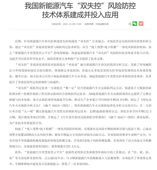 12月8日消息,市场监管总局今日发文宣布,我国新能源汽车“双失控”风险防控技术体系建成并投入应用。